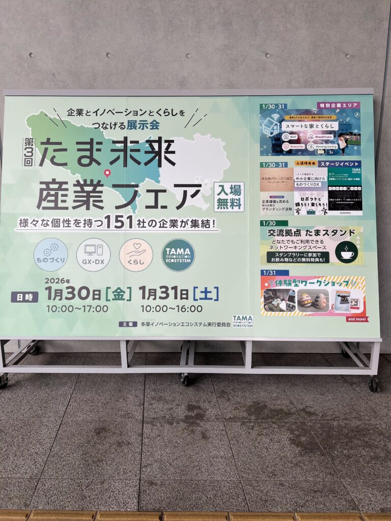 インフォメーション 無事に初日を終えました。 2026.01.31 東京未来たまメッセで開催された「第3回 たま未来・産業フェア」にブース出展で参加した初日の30日(金)を無事に終えられました。予想以上の来場者に若干戸惑いながらも、しっかりお話をしてきました。訪問くださいました皆様、ありがとうございました。